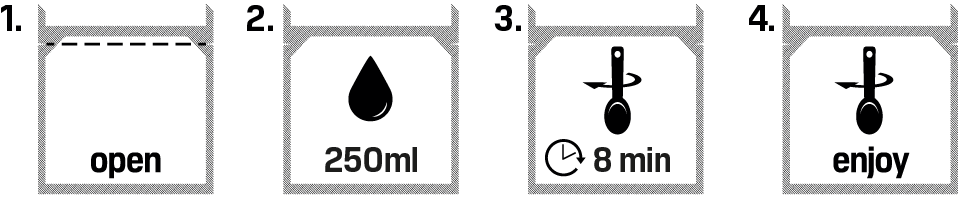 [1] Open. [2] Add 250ml of hot or boiling water. [3] Stir and wait 8 min. [4] Stir again and Enjoy!