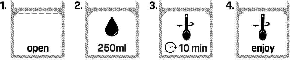 [1] Отвори. [2] Добави 250мл гореща вода. [3] Разбъркай и изчакай 10 мин. [4] Разбъркай пак и се наслади.