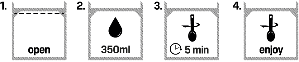 [1] Отвори. [2] Добави 350мл гореща вода. [3] Разбъркай и изчакай 5 мин. [4] Разбъркай пак и се наслади.
