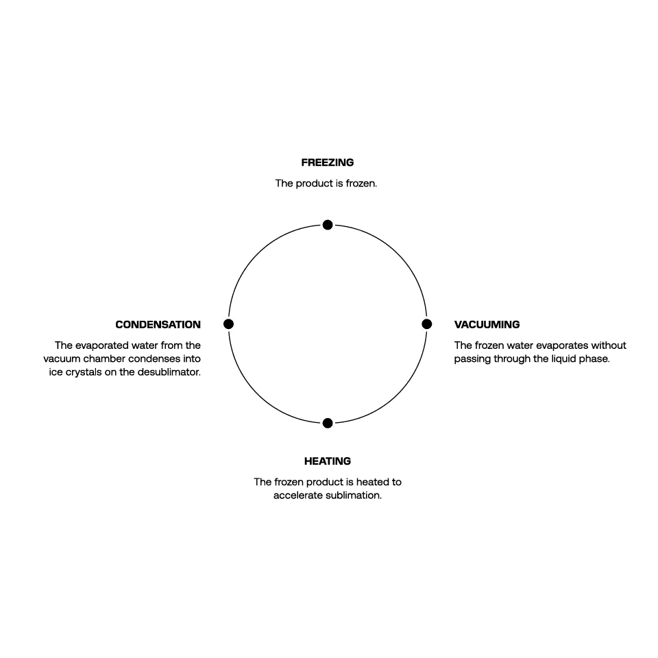 Our freeze-dried space food is produced using lyophilization, which operates based on a physics principle called sublimation, wherein the substance transitions directly from the solid to the gas state without passing through the liquid state. The outcome is the lightest food ever produced, offering high energy value while preserving essential nutritional properties and beneficial ingredients.